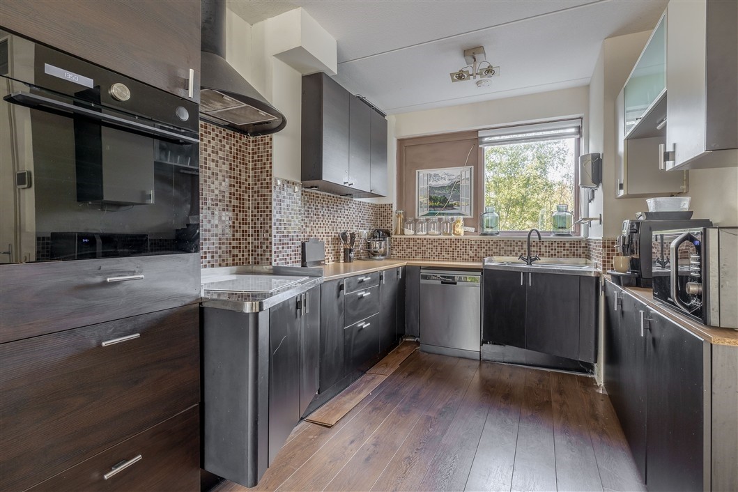 Open Keuken, 7 m² met U-vormig blok v.v. enkele spoelbak, close-in-boiler, inductieplaat, afzuigkap, vaatwasser, oven en laminaatvloer.
