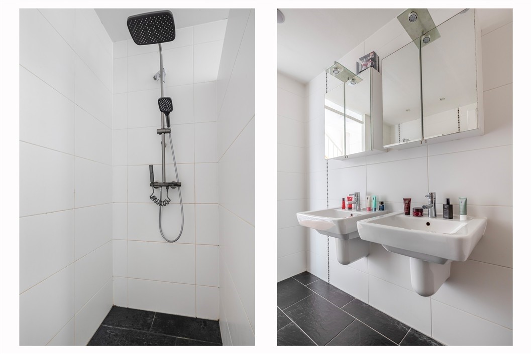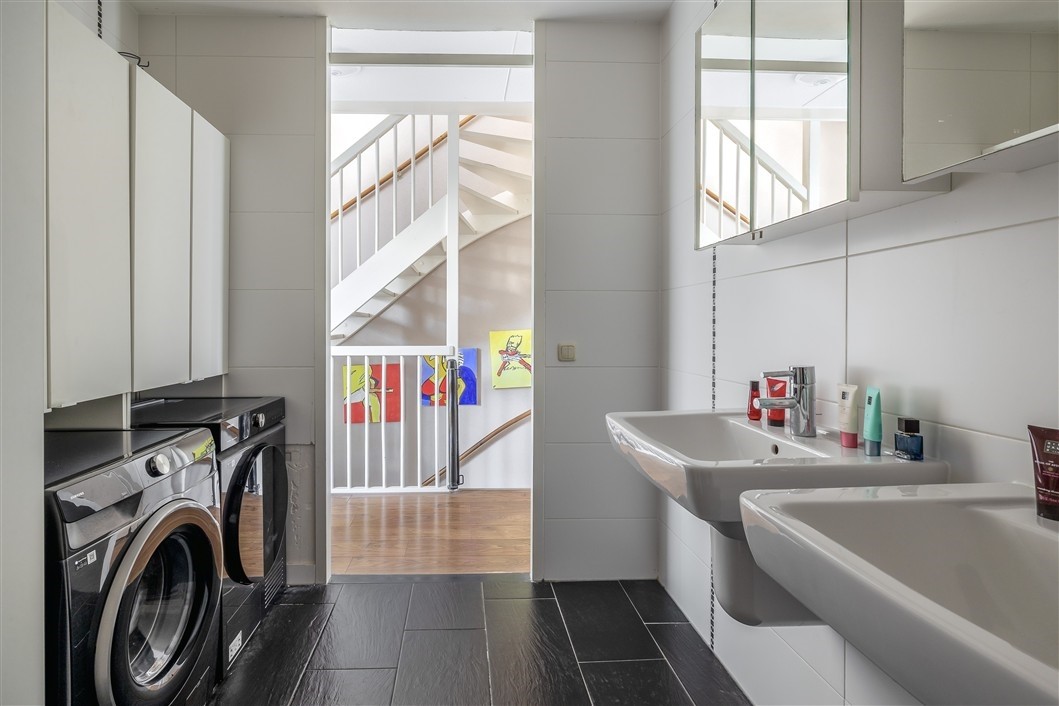 Badkamer met inloopdouche, dubbele wastafel, aansluiting WA/Droger en mechanische ventilatie.