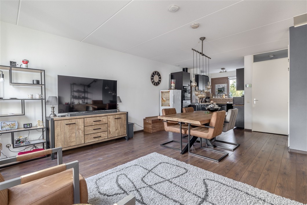 Tuingerichte woonkamer, 31 m² met voorraadkast, laminaat en openslaande deuren.