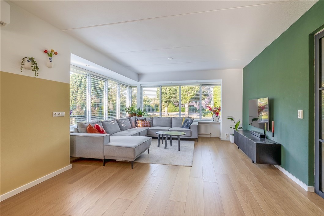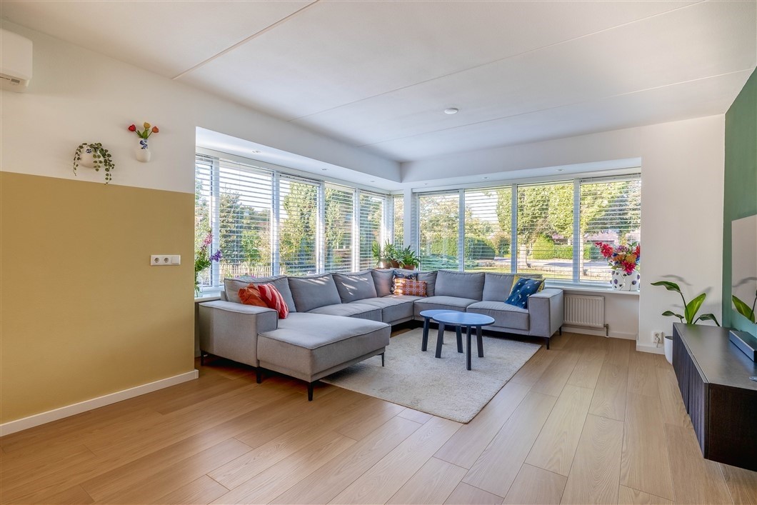 L-vormige woonkamer, ca. 35 m², v.v. laminaatvloer (2025), structuurwand, kunststof erkerkozijnen met elektrische zonwering en schuifpui naar de tuin.