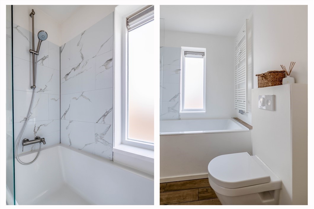 Badkamer, ca. 5 m², vernieuwd in 2021, v.v. inloopdouche, wastafelmeubel, 2e toilet en mechanische ventilatie.
