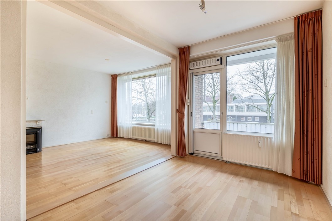 Woonkamer, 30 m², v.v. parketvloer, haard en grote raampartijen met toegang tot het balkon op het zuiden.
