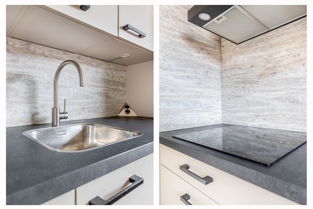 Keuken, 10 m², ruim opgezet en vernieuwd in 2023, v.v. moderne inbouwapparatuur, inductiekookplaat, afzuigkap, koelkast, oven en een vaste kast.