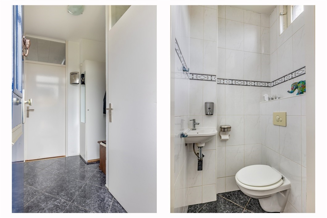 De woning beschikt op de begane grond een prima entree/hal (4,5 m²) is voorzien van plavuizen. Vanuit de hal is er toegang tot de toiletruimte, welke beschikt over een fonteintje. Via de hal is de ruime woonkamer (33 m²) te bereiken, deze sfeervolle woonkamer is gelegen in een speelse Z-vorm en beschikt over een warme houten vloer, een schuifpui naar de tuin en een vaste trap naar de eerste verdieping, wat zorgt voor een open en lichte sfeer.