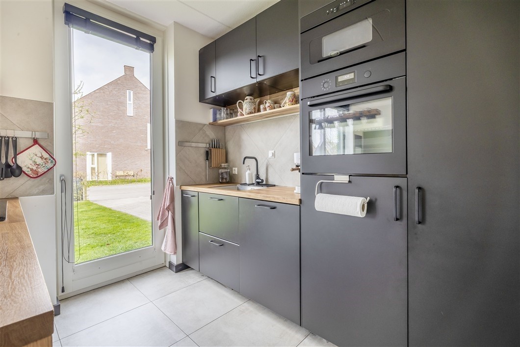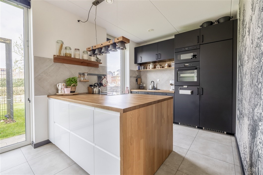 De open keuken heeft een moderne opstelling met kookeiland en is uitgerust met diverse inbouwapparatuur, waaronder een inductiekookplaat met geïntegreerde afzuiging, oven, vaatwasser, koelkast en vriezer. De gehele begane grond is voorzien van plavuizen met vloerverwarming, wat zorgt voor extra comfort en een strakke uitstraling.
