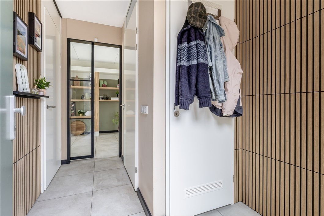 Entree/hal, 4.4 m², v.v. plavuizen, wandpanelen met houten latten en trapopgang. Meterkast aanwezig.