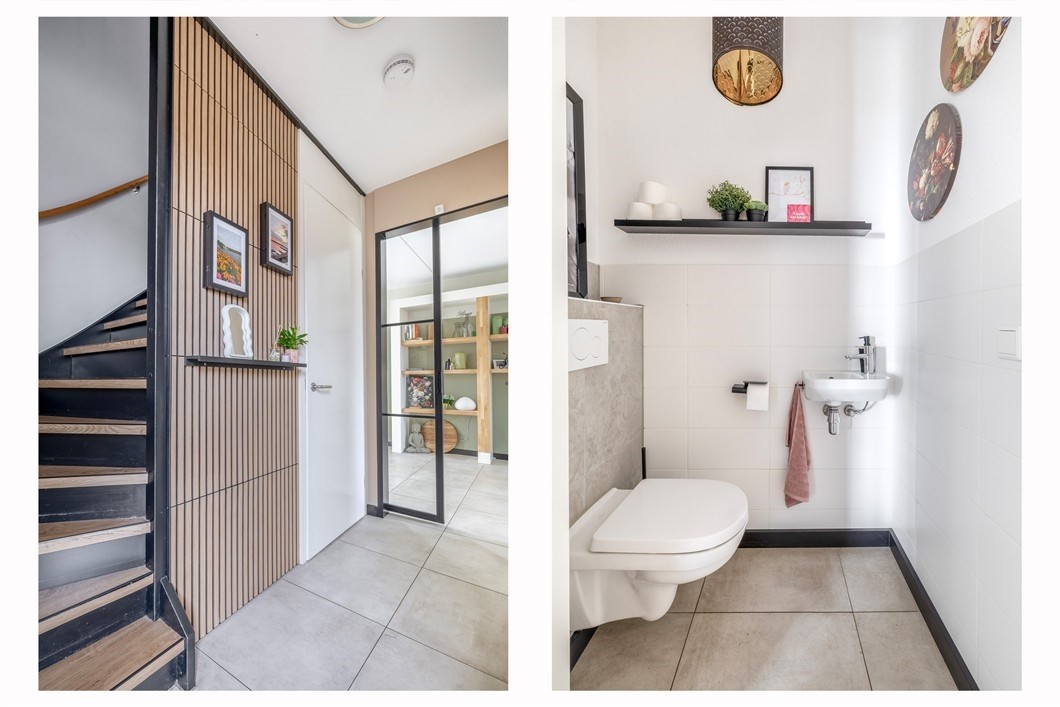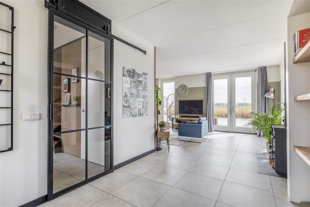 Bij binnenkomst ervaart u direct de moderne en verzorgde afwerking. De hal is voorzien van plavuizen, stijlvolle wandpanelen met houten latten en een trapopgang naar de verdieping. De moderne toiletruimte is uitgevoerd met een wandcloset, fonteintje en lichte plavuizen. De ruime woonkamer is tuingericht, heerlijk licht en beschikt over vloerverwarming en directe verbinding met de achtertuin aan het water. Dankzij de grote leefruimte is er volop plek voor een royale zithoek en een gezellige eethoek.