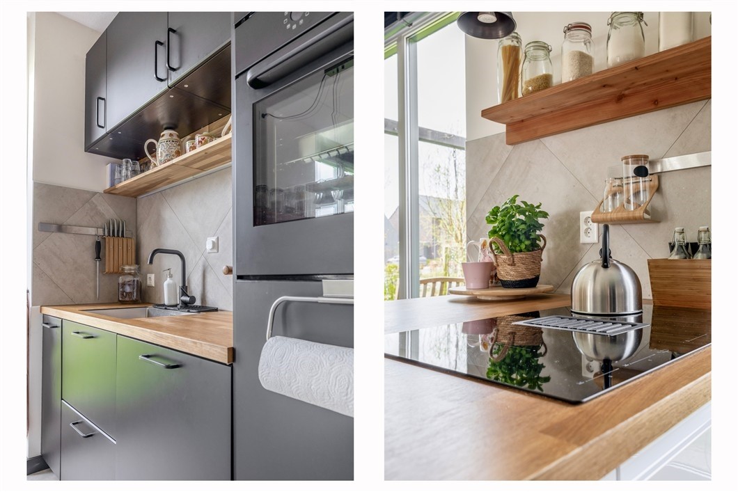 Open keuken, 8 m², moderne opstelling v.v. kookeiland, inductiekookplaat met geïntegreerde afzuiging, oven, vaatwasser, koelkast en vriezer.