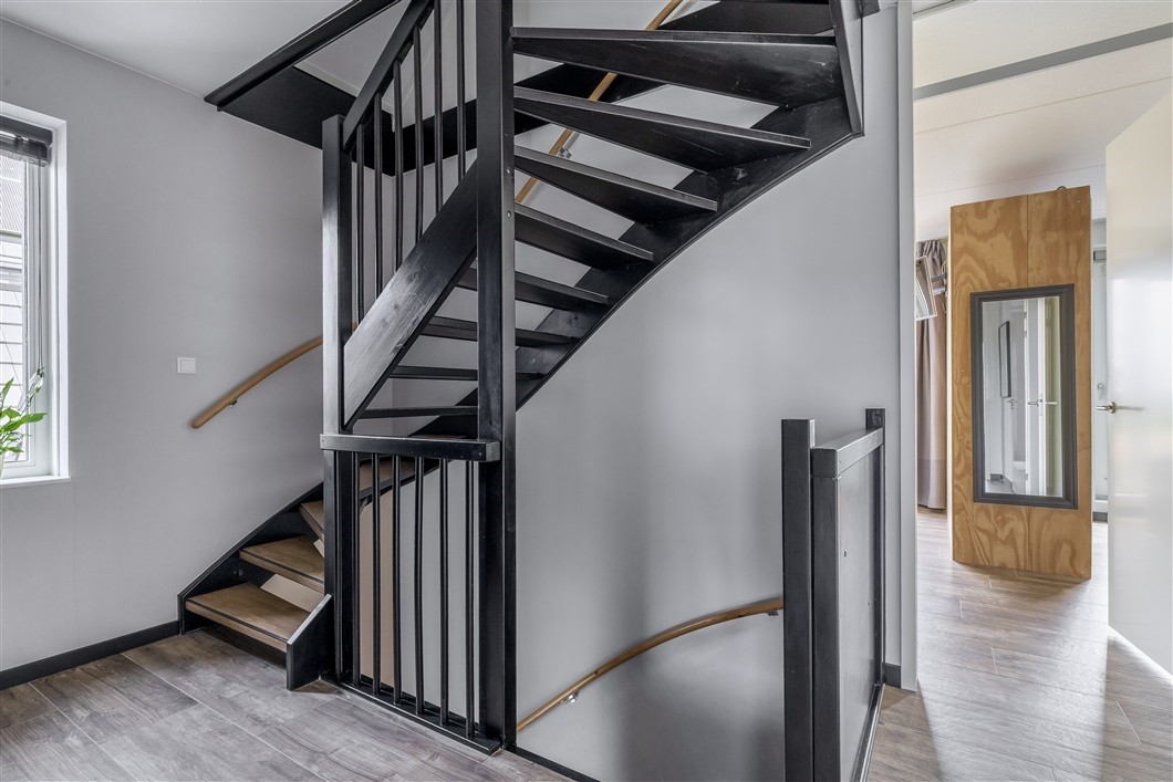 Overloop, v.v. plavuizen vloer met laminaat-look, vaste trap naar de tweede verdieping.