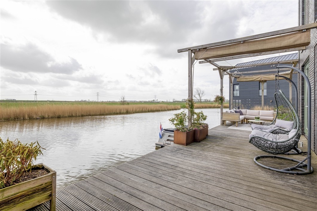 Achtertuin aan het water, 74 m², vlonderterras gelegen op het Zuidoosten met eigen aanlegsteiger.