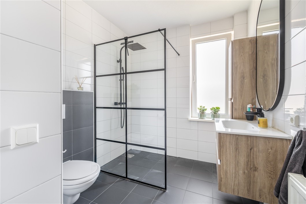 Badkamer, 4 m², modern uitgevoerd, v.v. inloopdouche met glazen wand en regendouche, wastafelmeubel, toilet en vloerverwarming.