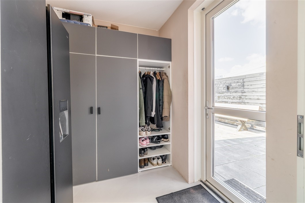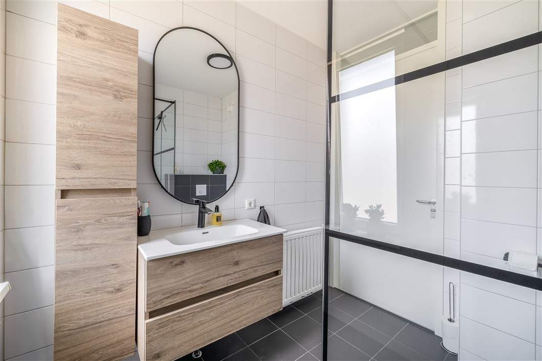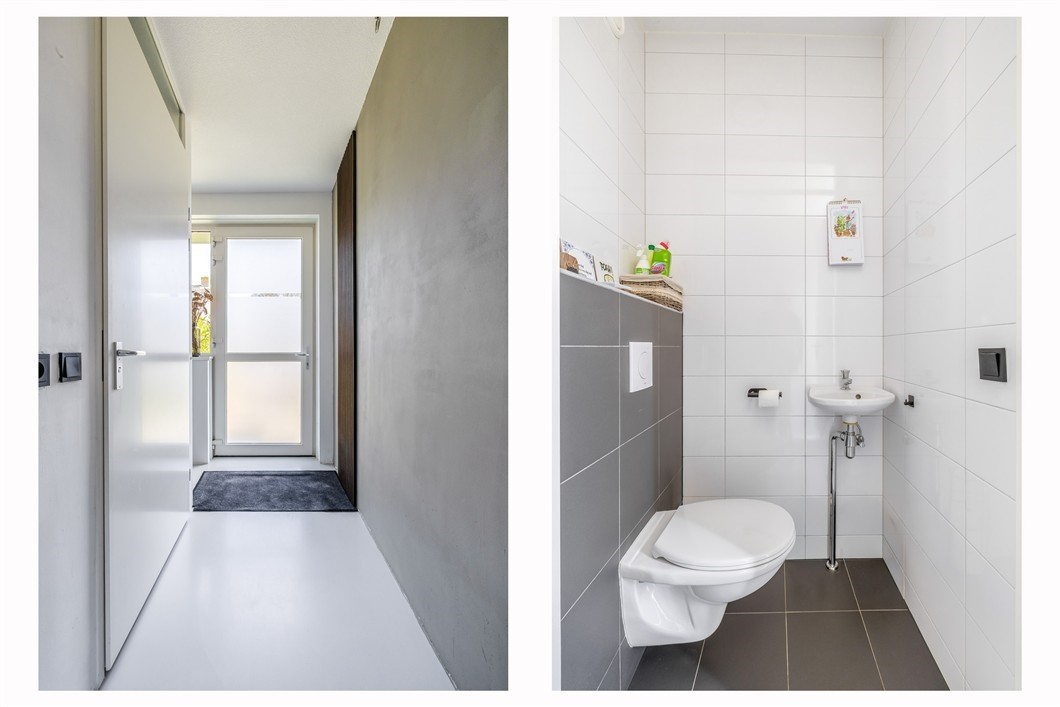 In de woning ervaart u direct de moderne en verzorgde afwerking. De hal is voorzien van een strakke gietvloer en een stijlvolle trapopgang met zwartstalen leuning. De toiletruimte is modern uitgevoerd met een wandcloset en lichte tegelafwerking. De tuingerichte woonkamer is heerlijk licht dankzij de grote schuifpui en staat in directe verbinding met de achtertuin. De gietvloer in combinatie met vloerverwarming zorgt voor een comfortabel geheel. De open keuken is modern en praktisch ingericht, biedt veel werkruimte en beschikt over diverse inbouwapparatuur, waardoor koken hier een plezier is.