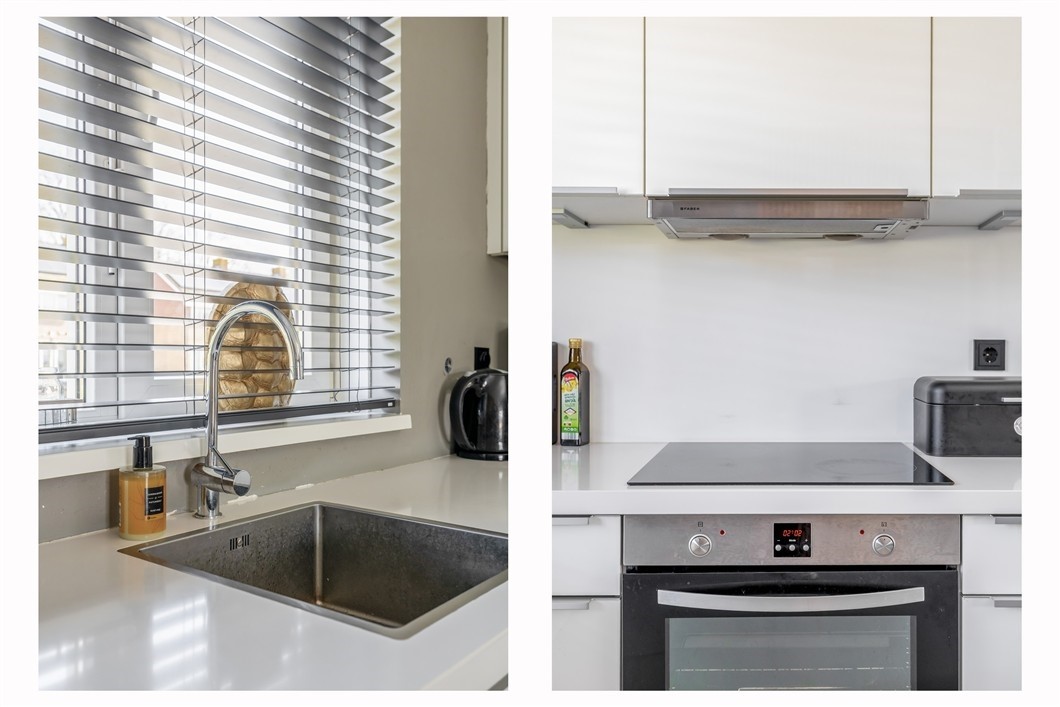 Open keuken, 7.5 m², moderne en lichte hoekopstelling v.v. inductiekookplaat, afzuigkap, oven, vaatwasser en koel-vriescombinatie.