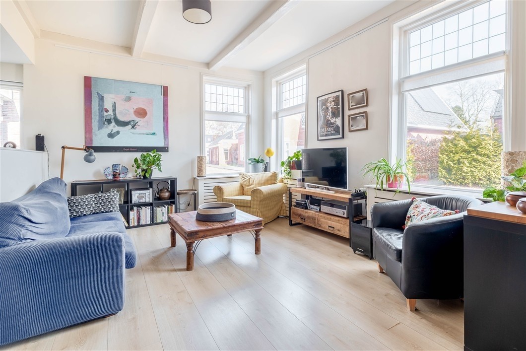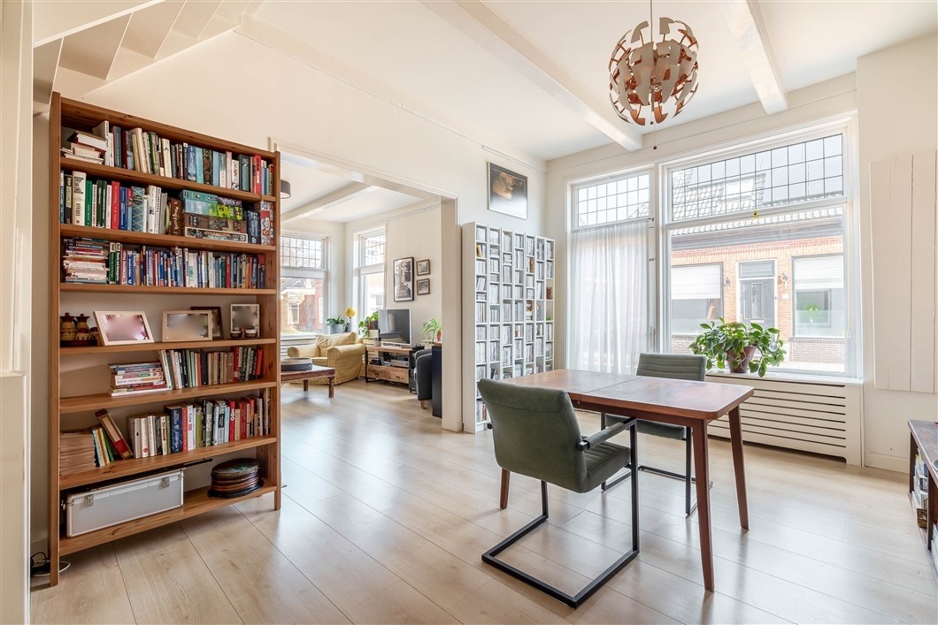 Bij binnenkomst valt direct de warme uitstraling op. De ruime woonkamer van maar liefst 41 m² is voorzien van stucwerk, een laminaatvloer en prachtige raampartijen, waaronder glas-in-lood. De ruimte is speels ingedeeld in een zitkamer en een bibliotheek, wat zorgt voor een gezellige en huiselijke sfeer.