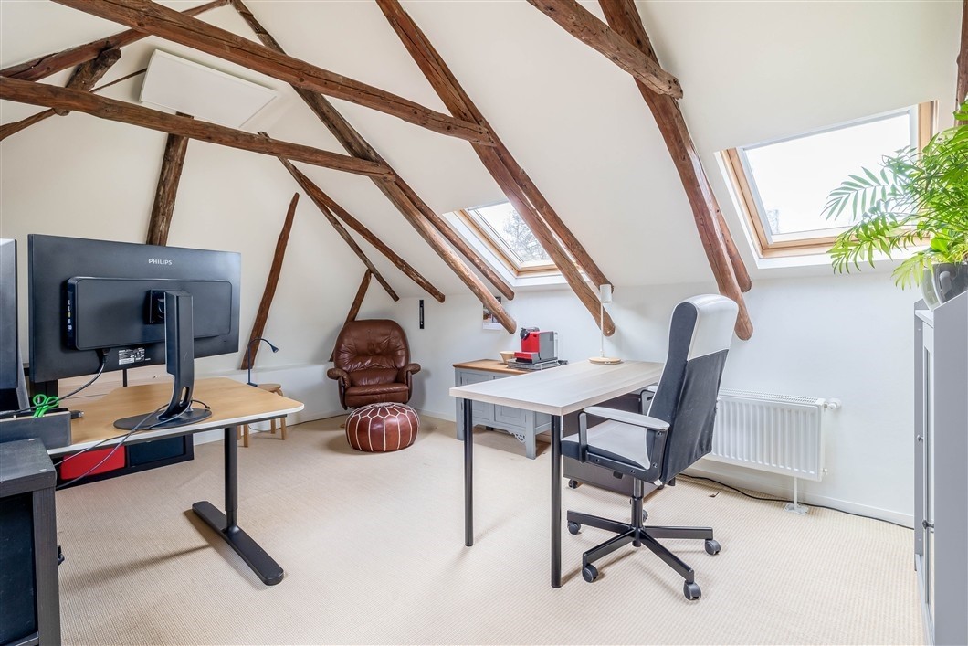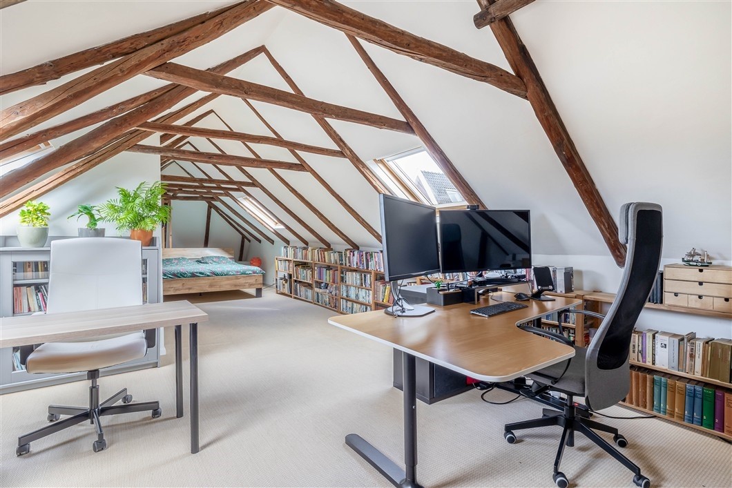 De eerste verdieping biedt een indrukwekkende derde slaapkamer van ruim 31 m², met de open kapconstructie en de zichtbare balken wordt het karakter en de sfeer ook hier extra benadrukt. Dankzij de ruimte en indeling is het eenvoudig om een extra slaapkamer te realiseren. Daarnaast is er nog praktische zolderberging aanwezig.