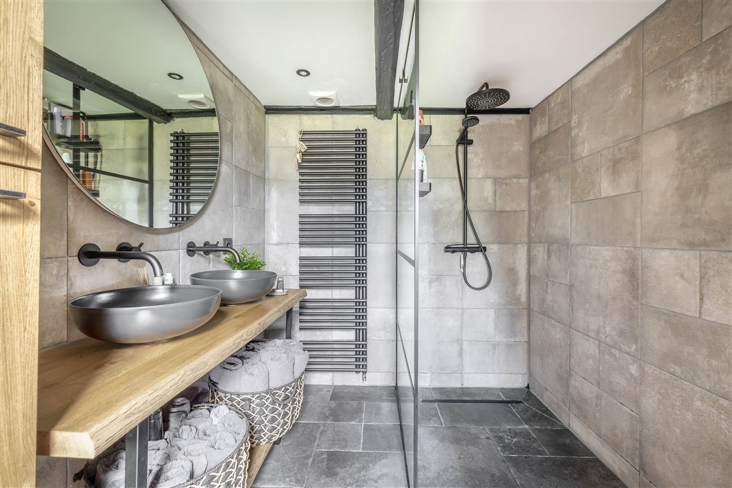 Badkamer, ca. 6 m², recent vernieuwd en voorzien van een moderne inloopdouche, wastafelmeubel en toilet.