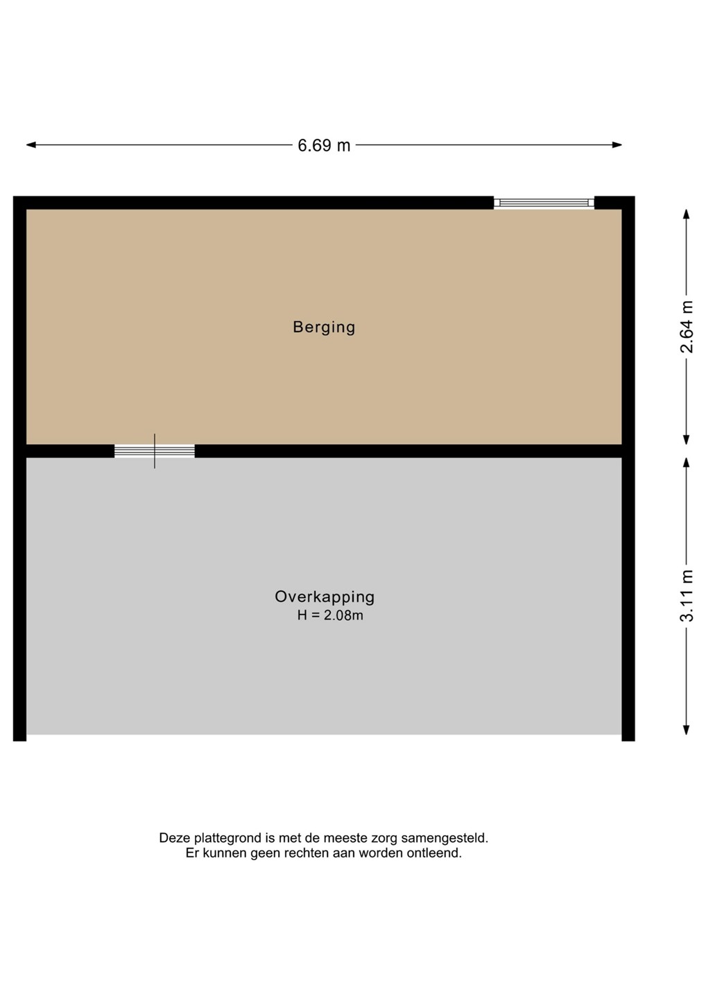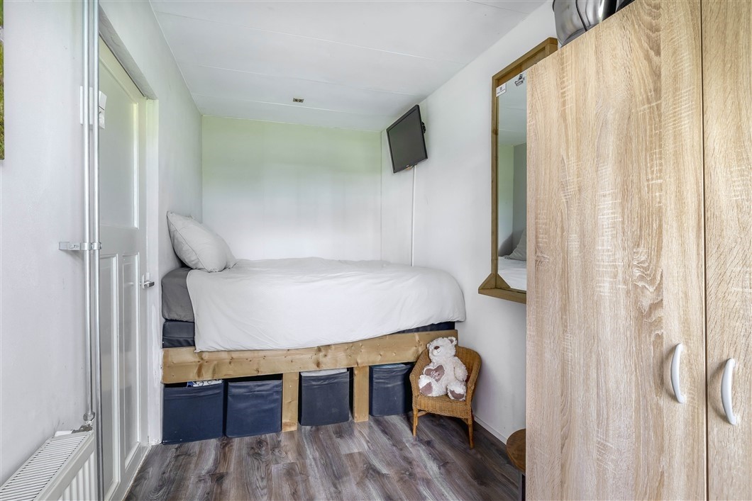 Ruime berging, ca. 18 m² met elektra-aansluiting en praktische overkapping, ideaal voor opslag, hobby of loungeplek in de tuin.