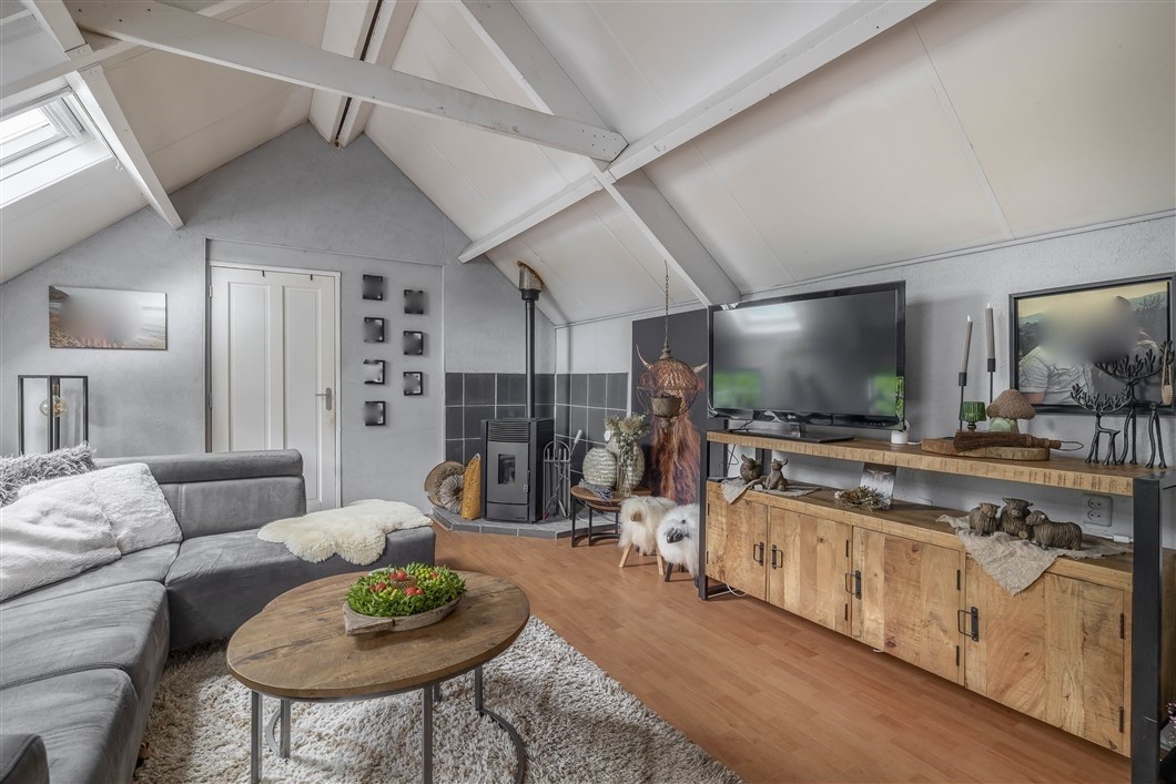 Via de vaste trap bereikt u de zolderverdieping, ingericht als een slaapzolder met bergruimte onder de schuine kanten. Dankzij de dakramen is dit een lichte hobbykamer.