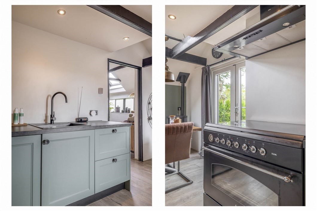 Keuken, ca. 10 m², vernieuwd in 2022, voorzien van moderne inbouwapparatuur en kunststof openslaande deuren (2024) naar de tuin.