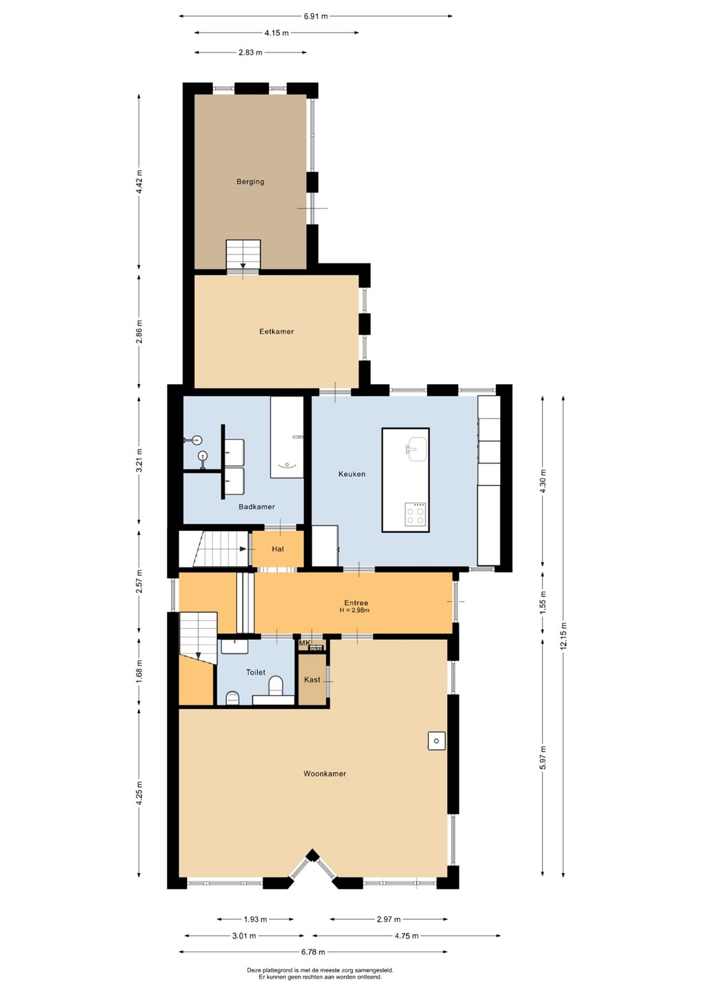 Berging, 12,5 m², aangebouwd van steen te bereiken via de eetkamer, v.v. elektra en vliering.