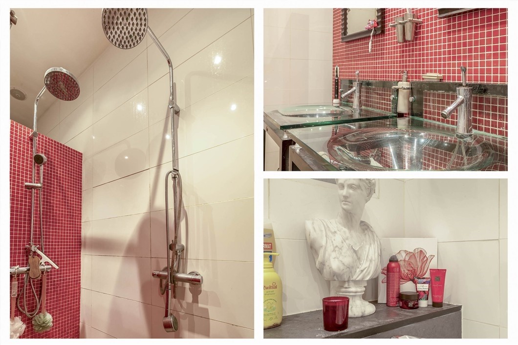 Badkamer beneden, 9,6 m², v.v. plavuizen, inloopdouche met twee stortdouches, ligbad en dubbele wastafel.