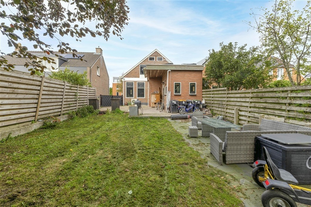 Achter de woning is de besloten achtertuin (194 m²) gelegen, deze is voorzien van een terras en een groot gazon en is gericht op het Zuid-Oosten waardoor het lang genieten is van de zon. Naast de woning is de zijtuin gelegen, deze is grotendeels bestraat en biedt voldoende parkeerruimte op eigen terrein.