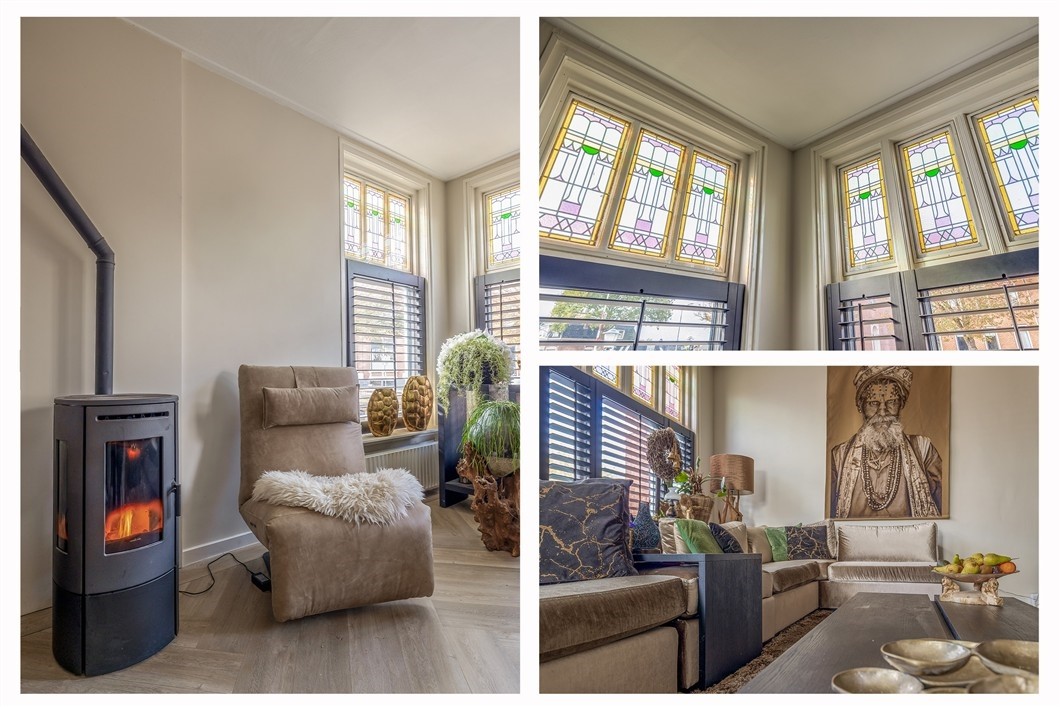 * Sfeervolle woonkamer met glas-in-loodramen en pelletkachel