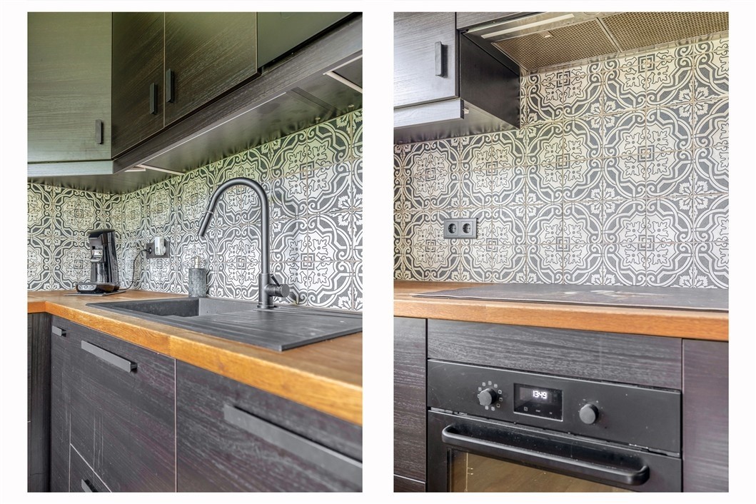 De woonkamer voelt ruim en licht door de grote raampartijen die uitzicht geven op de groene tuin. De haardpartij brengt extra sfeer in de koudere maanden en de tuindeur opent naar het terras. De moderne half open keuken uit 2020 sluit aan op de eethoek en is uitgerust met diverse inbouwapparatuur. De combinatie van houten details en donkere fronten geeft de keuken een warme en eigentijdse stijl.