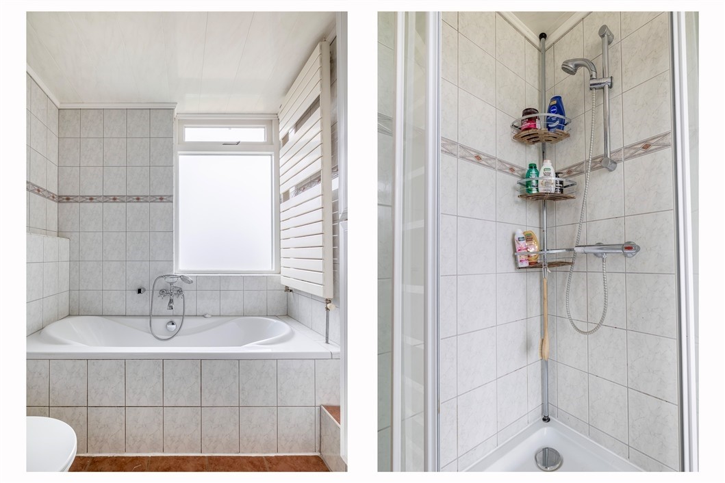 Badkamer, 5.8 m², v.v. ligbad, douche, (hang)closet en wastafelmeubel.