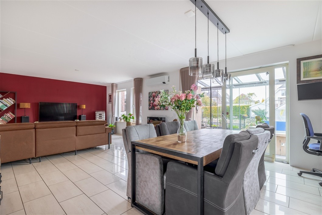 De entree geeft toegang tot de centrale hal met toilet, meterkast en trapopgang. De sfeervolle tuingerichte woonkamer van 40,5 m² heeft een royale indeling met grote raampartijen die zorgen voor veel natuurlijk licht. De betegelde vloer is voorzien van vloerverwarming, de sfeerhaard en de airco bieden u een aangenaam comfort. Vanuit de woonkamer is ook de serre bereikbaar, dankzij de infraroodverwarming is deze serre het hele jaar door een fijne plek om te zijn.