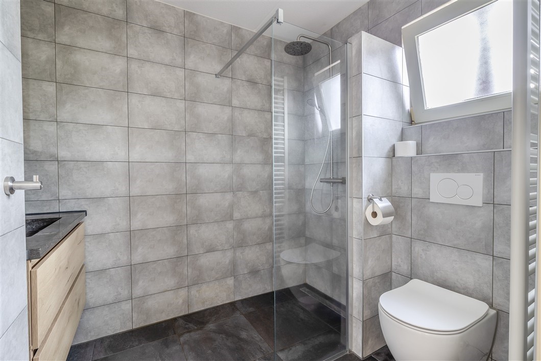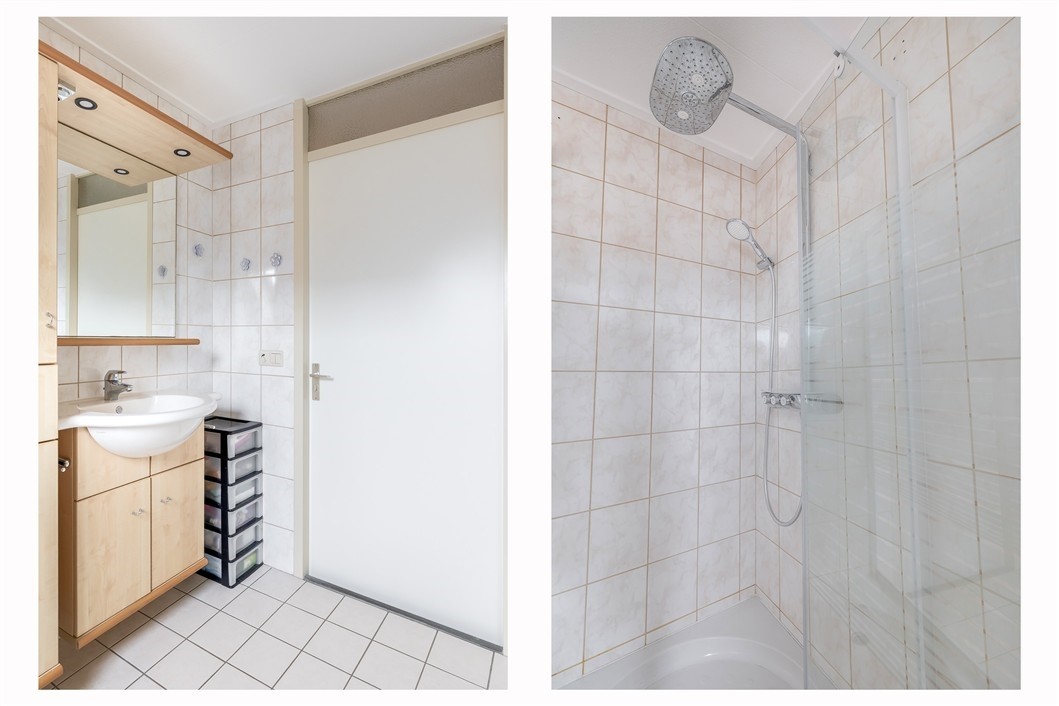 Een groot pluspunt is de slaapkamer op de begane grond van 12,5 m², uitgevoerd met een laminaatvloer en rolluiken. Deze kamer beschikt over een eigen moderne badkamer met een inloopdouche, wastafelmeubel en toilet, de woning is dus ook levensloopbestendig.