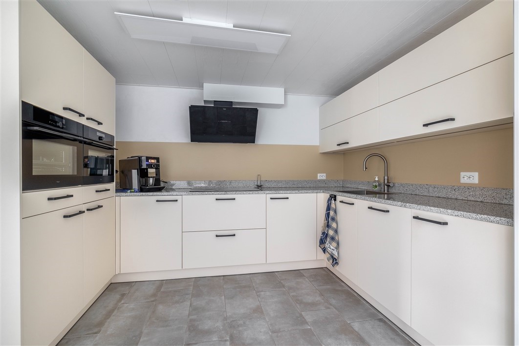 Luxe WoonKeuken, 20 m², vernieuwd in 2023, voorzien van U-vormig blok met inductiekookplaat, afzuigap, quooker, oven ,magnetron, koelkast, vaatwasser, plavuizen en vloerverwarming.
