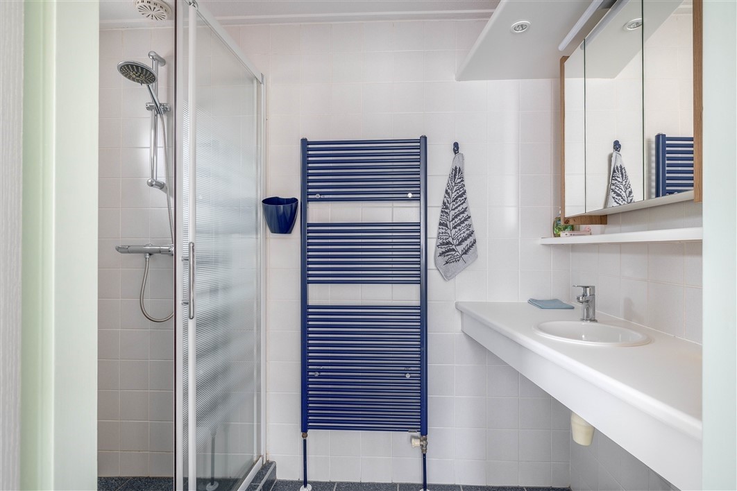 Badkamer, 4 m², uitgerust met een ruime douche, wastafel en designradiator.