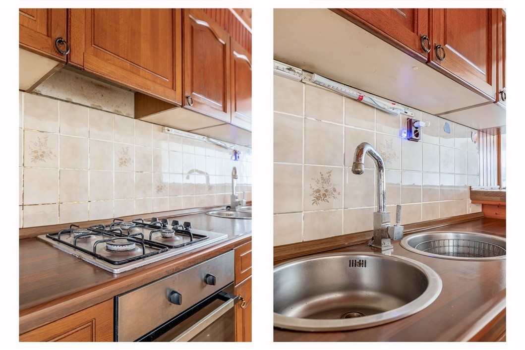 Keuken, 9 m², v.v. een laminaatvloer, 4-pits gasfornuis, afzuigkap, oven, koelkast en dubbele spoelbak.