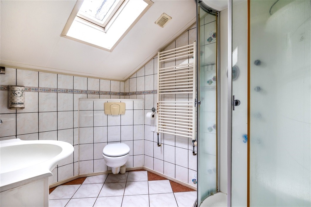 Badkamer, 8 m², v.v. plavuizen, douchecabine, wastafelmeubel, toilet en dakraam.