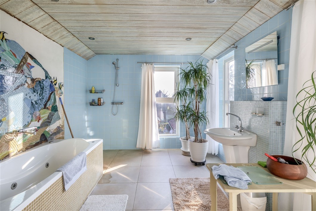 Badkamer, 13 m², v.v. betegeling, douche, ligbad, wastafel en toilet.